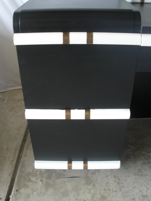Description:Retro vanity from the art deco era. Middle drawer and two side drawers. Clear mirror attached. Freshly painted black and white. Please see the matching bed I have listed as well.